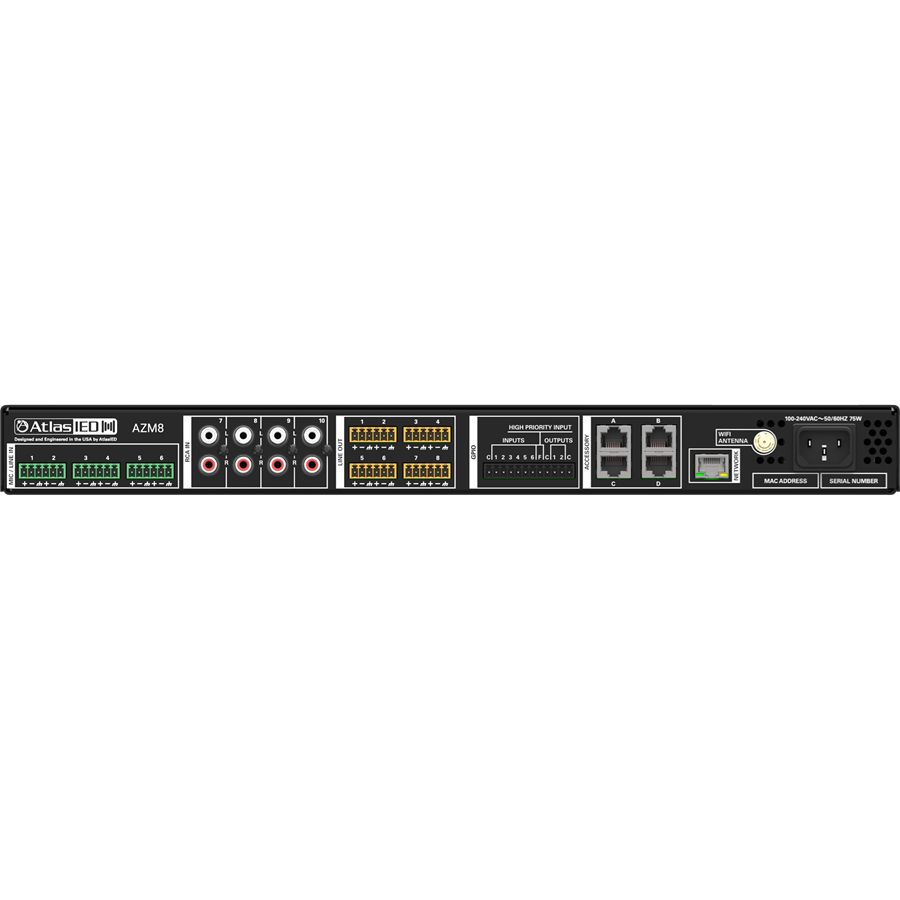The Atmosphere AZM8 is an 8-zone audio processor and the heart of an Atmosphere audio control system. Powerful DSP combined with innovative algorithms offer custom solutions for a wide variety of spaces. A built-in message player, virtual wall controllers, learning ambient noise sensing, Tilter Filter™, auto-gain, GPIO, scheduler, and many more features, make the AZM a processing powerhouse.