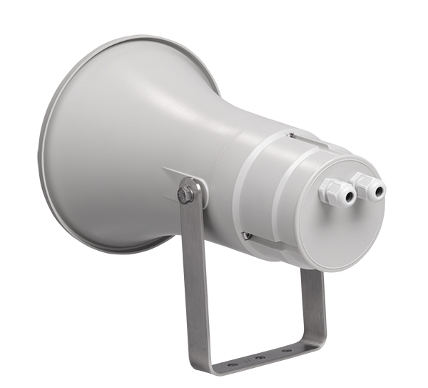 Wetterfester Druckkammer-Lautsprecher für Sprachalarmierung, zertifiziert gemäß EN 54-24, geeignet für industriellen Einsatz mit hohem Schalldruck in Innen- und Außenbereichen.