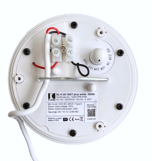 Das schlagzähe, UV-beständige ABS-Kunststoffgehäuse in RAL 9016 garantiert nachhaltige Stabilität. Für zusätzliche Betriebssicherheit sorgen die 2-polige-Keramikklemme, eine Thermosicherung, eine im Baldachin integrierte PG-Verschraubung, sowie die Feuchtigkeitsimprägnierung des Lautsprecher-Chassis.