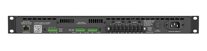 Der DPA602 kann direkt – ohne Konfiguration und Vernetzung – eingesetzt werden. Er ist als 2-Kanal-Verstärker für den 100 Volt Betrieb vorkonfiguriert. Außerdem kann der Verstärker über die integrierte Webbrowser-Oberfläche auch im 4-Kanal-Modus an 4 oder 8 Ohm für zwei Stereozonen konfiguriert werden.