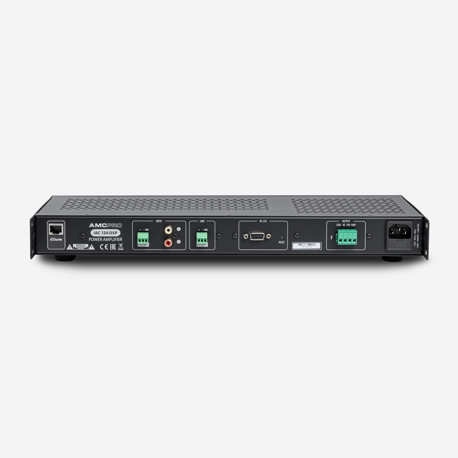 Single-channel Class-D amplifier with 120 W power output. Created for 100 V and low impedance high-quality background music systems. Silent fan mode, DSP processing: 6-point parametric EQ, limiter, gate, delay. Containing Dante digital input card, Balanced Phoenix & Stereo RCA input and audio link output connectors. Amplifiers have an RS232 control port for integration amplifiers with third-party automation systems that allow using iAC amplifiers in large and complex audio systems that can be automated and controlled remotely.